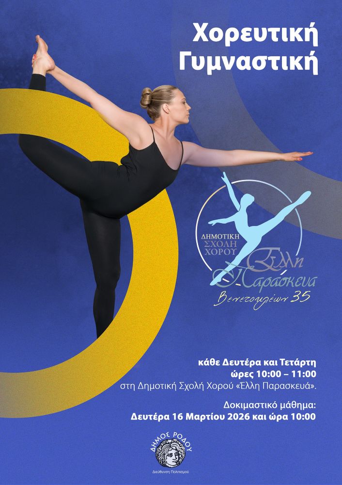 Η Διεύθυνση Πολιτισμού του Δήμου Ρόδου, στο πλαίσιο των εργαστηρίων της, ανακοινώνει την πρόθεσή της να δημιουργήσει πρωινό τμήμα χορευτικής γυμναστικής.