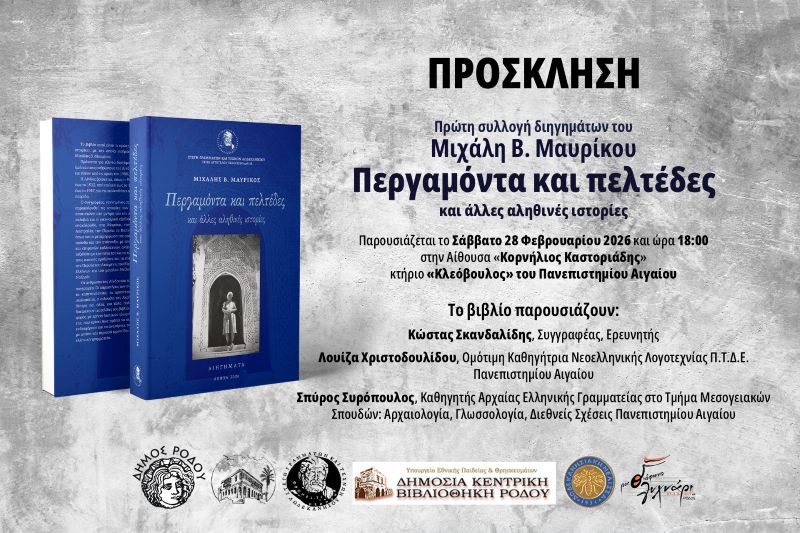 Με αφορμή την έκδοση του πρώτου βιβλίου διηγημάτων του Μιχάλη Β. Μαυρίκου «Περγαμόντα και Πελτέδες και άλλες αληθινές ιστορίες», μια έκδοση της Στέγης Γραμμάτων και Τεχνών Δωδεκανήσου (σειρά αυτοτελών εκδόσεων, αρ. 48), συμπράττουν και συνεργάζονται σημαντικοί φορείς του τόπου μας, που για χρόνια στηρίζουν και αναδεικνύουν την πνευματική δημιουργία και στηρίζουν την Παιδεία και τον Πολιτισμό.