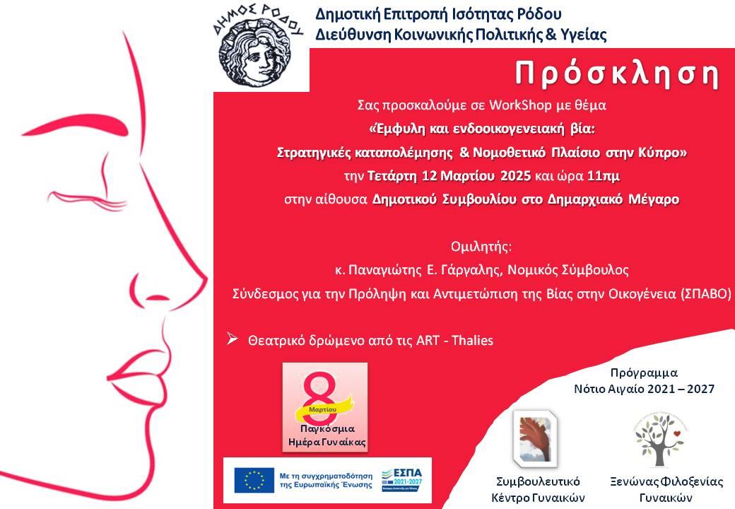 Workshop με θέμα: «Έμφυλη και ενδοοικογενειακή βία: Στρατηγικές καταπολέμησης & Νομοθετικό Πλαίσιο στην Κύπρο» από το Σύνδεσμο Πρόληψης και Αντιμετώπισης της Βίας στην Οικογένεια της Κύπρου – Στο τέλος θα παρουσιαστεί Θεατρικό δρώμενο από τις Art-Thalies.
