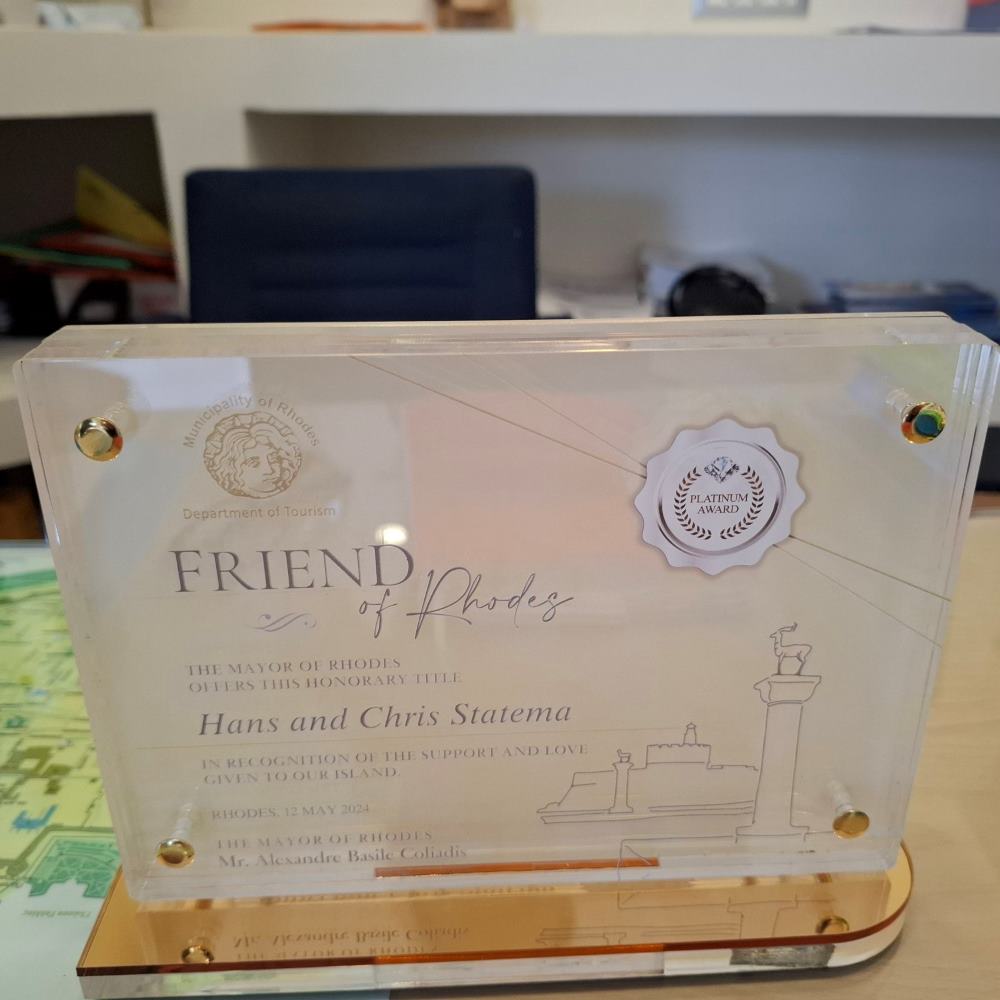 Η Διεύθυνση Τουρισμού Δήμου Ρόδου τους απένειμε τις ανώτερες τιμητικές διακρίσεις, μία πλατινένια πλακέτα και μία χρυσή τιμητική διάκριση, καθώς αποτελούν τους καλύτερους πρεσβευτές του νησιού.