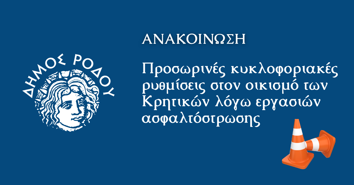 Στο πλαίσιο εκτέλεσης εργασιών ασφαλτόστρωσης οδοστρωμάτων στη Δ.Ε. Ρόδου, σας ενημερώνουμε ότι από την Τρίτη 28 έως και την Τετάρτη 29 Απριλίου ο δρόμος στον οικισμό των Κρητικών (και συγκεκριμένα η παραλιακή λωρίδα εξόδου προς Ιαλυσό από το ξενοδοχείο Ποσειδών έως το τέλος της διαχωριστικής νησίδας) θα παραμείνει κλειστός. Ο φόρτος των οχημάτων στην ευρύτερη περιοχή θα διοχετεύεται σε παράπλευρες οδούς οι οποίες είναι ικανές να ανταπεξέλθουν με ασφάλεια στις προσωρινές κυκλοφοριακές ρυθμίσεις.