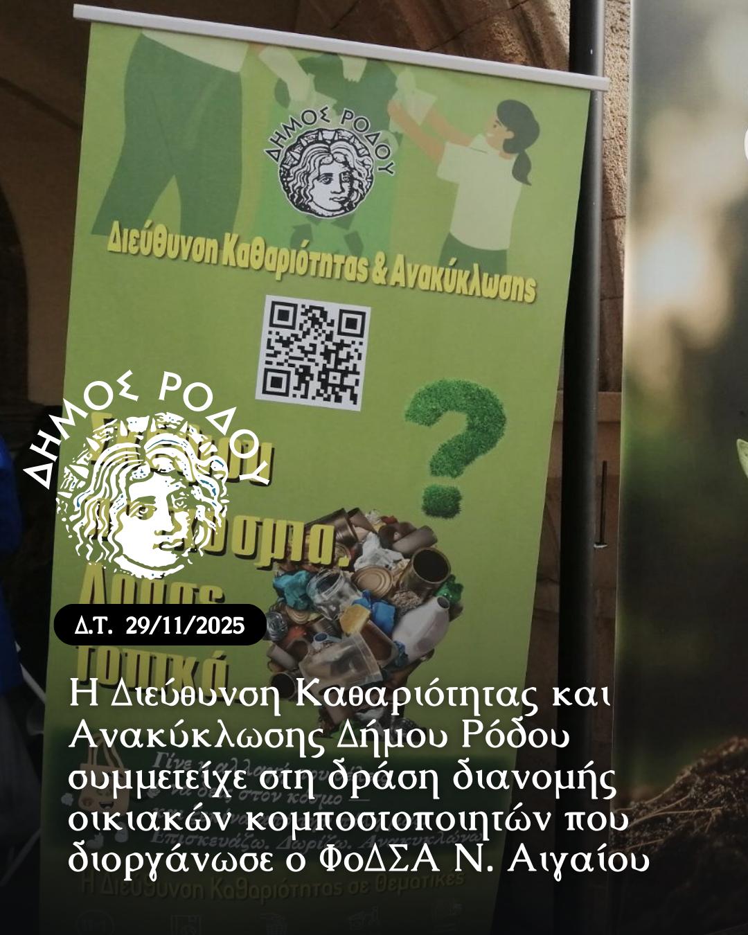 Ο Δήμος Ρόδου και η Διεύθυνσης Καθαριότητας και Ανακύκλωσης συμμετείχαν την Παρασκευή 28 Νοεμβρίου στη δράση διανομής οικιακών κομποστοποιητών που πραγματοποιήθηκε στη Ρόδο, και την οποία διοργάνωσε ο ΦοΔΣΑ Νοτίου Αιγαίου με τίτλο « Ό, τι πιο green θα κάνεις φέτος».