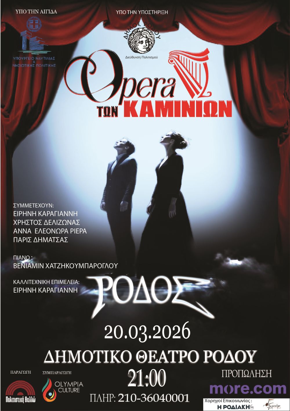 Το Δημοτικό Θέατρο Ρόδου ανοίγει τις πύλες του για να υποδεχθεί την «Όπερα των Καμινίων», σε μια ξεχωριστή μουσική παράσταση που θα πραγματοποιηθεί την Παρασκευή 20 Μαρτίου 2026 και ώρα 21:00.
