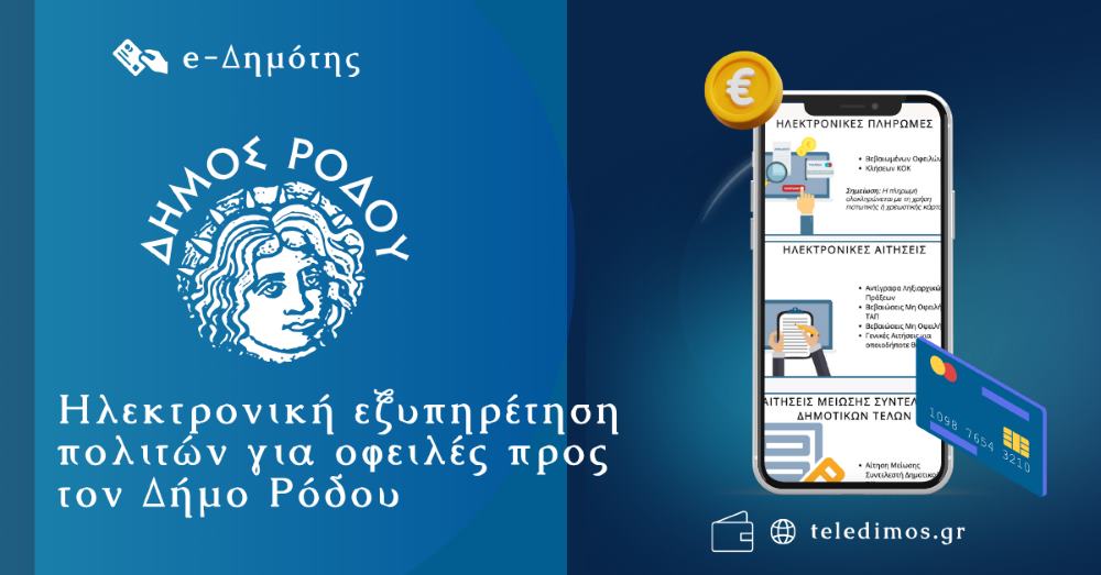 Ο Δήμος Ρόδου διευκολύνει τους πολίτες, δίνοντάς τους τη δυνατότητα να πραγματοποιούν ηλεκτρονικά τις συναλλαγές και τις αιτήσεις τους, με ασφάλεια, ταχύτητα και χωρίς περιορισμούς ωραρίου, μέσω της πλατφόρμας teledimos.gr.