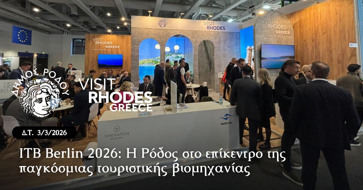 Στη Διεθνή Έκθεση Τουρισμού, ITB Berlin 2026, όπου από τις 3 έως τις 5 Μαρτίου χτυπά η καρδιά της παγκόσμιας τουριστικής βιομηχανίας, η Ρόδος μαγνητίζει όλα τα βλέμματα, επιβεβαιώνοντας τη δυναμική της ως ένας από τους πλέον ελκυστικούς προορισμούς της Μεσογείου. Στο κορυφαίο αυτό διεθνές γεγονός, ο Δήμος Ρόδου συμμετέχει με περίπτερο του ΠΡΟΤΟΥΡ, προβάλλοντας τη σύγχρονη ταυτότητα του νησιού, τις μοναδικές του ομορφιές, τις εναλλακτικές μορφές τουρισμού, την τοπική γαστρονομία και όλα τα συγκριτικά πλεονεκτήματα που καθιστούν τη Ρόδο ιδανικό ταξιδιωτικό προορισμό.