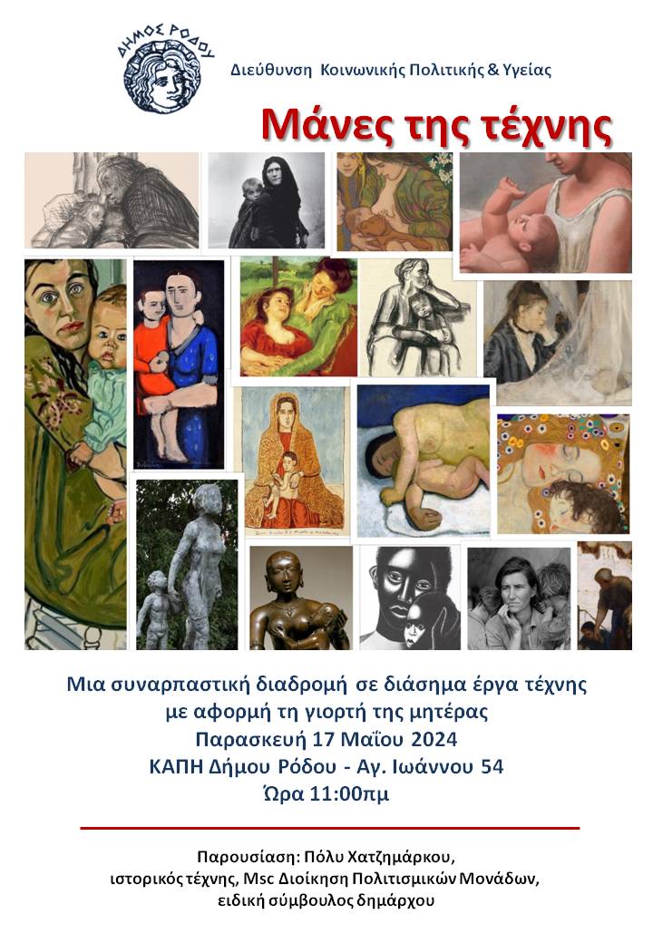 Με αφορμή τη γιορτή της μητέρας, θα ξετυλιχθεί μια συναρπαστική διαδρομή σε διάσημα έργα τέχνης με την παρουσίαση “Μάνες της τέχνης” που επιμελείται η Πόλυ Χατζημάρκου (ιστορικός τέχνης, Msc Διοίκηση Πολιτισμικών Μονάδων και ειδική σύμβουλος Δημάρχου).