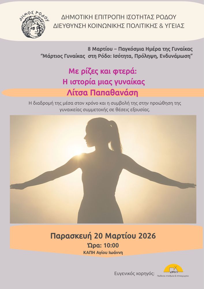 Οι δράσεις συνεχίζονται με μια σημαντική εκδήλωση στο ΚΑΠΗ Αγίου Ιωάννη Δήμου Ρόδου. Πιο συγκεκριμένα, την Παρασκευή 20 Μαρτίου και ώρα 10:00 θα πραγματοποιηθεί ομιλία της Λίτσας Παπαθανάση, πρώην Προέδρου του ΚΑΠΗ Δήμου Ροδίων, με τίτλο «Με ρίζες και φτερά: Η ιστορία μιας γυναίκας». Μέσα από την προσωπική της διαδρομή στον χρόνο, η ομιλήτρια θα μοιραστεί εμπειρίες ζωής και δημόσιας προσφοράς, αναδεικνύοντας τη σημασία της συμμετοχής των γυναικών στα κοινά και στα κέντρα λήψης αποφάσεων.