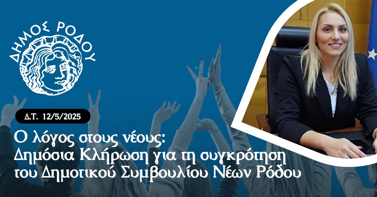Ο Δήμος Ρόδου κάνει ένα σημαντικό βήμα για να ενισχύσει τη συμμετοχή των νέων ανθρώπων στα κοινά. Την Τετάρτη 21 Μαΐου 2025 στις 17:00, στην αίθουσα συνεδριάσεων του Δημοτικού Συμβουλίου, θα γίνει δημόσια κλήρωση για την επιλογή των 25 μελών και των αναπληρωτών του Δημοτικού Συμβουλίου Νέων.