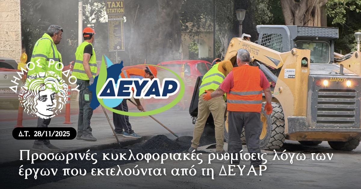 Στο πλαίσιο ολοκλήρωσης της Β’ φάσης του έργου «ΕΠΕΙΓΟΥΣΑ ΑΝΤΙΚΑΤΑΣΤΑΣΗ ΚΑΤΑΘΛΙΠΤΙΚΟΥ ΑΓΩΓΟΥ – ΑΝΤΛΙΟΣΤΑΣΙΟΥ ΕΛΛΗ Δ.Ε. ΡΟΔΟΥ», η ΔΕΥΑΡ ενημερώνει το κοινό για τις προσωρινές κυκλοφοριακές ρυθμίσεις που τίθενται σε εφαρμογή για την ασφαλή και ομαλή διεξαγωγή των εργασιών.