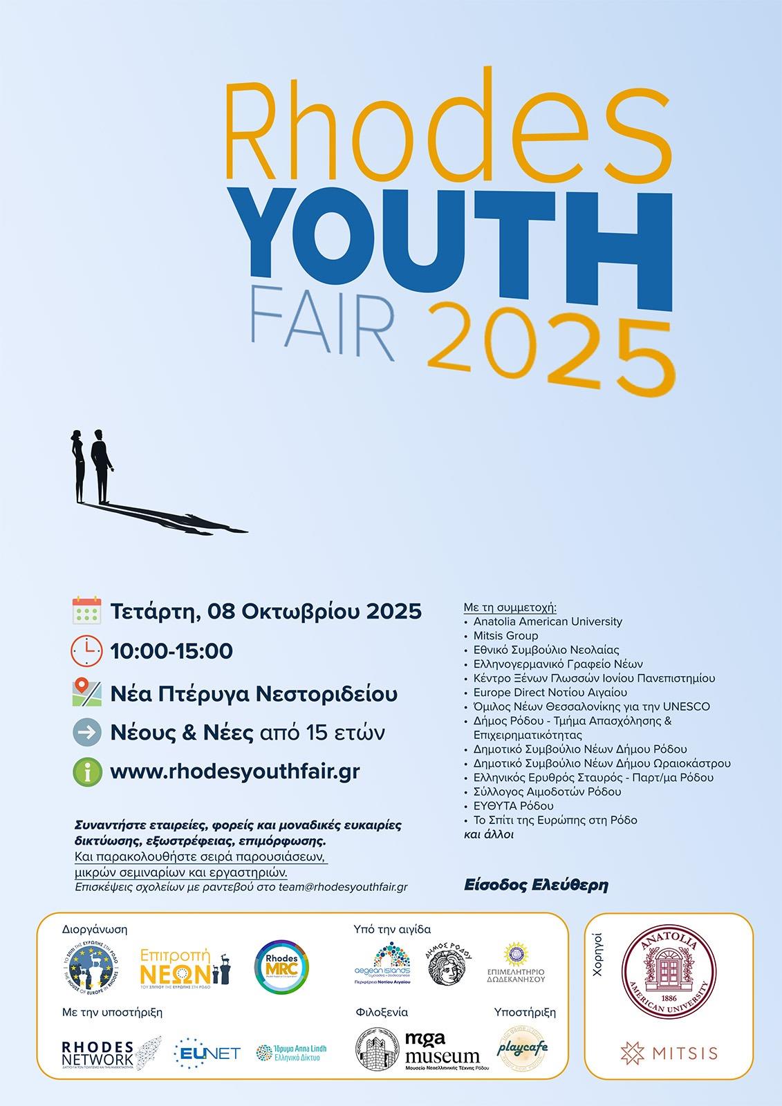 Έρχεται το πρώτο Rhodes Youth Fair, μια καινοτόμα εκδήλωση που στοχεύει να συνδέσει τη νέα γενιά της Ρόδου με κορυφαίους εκπαιδευτικούς φορείς και ευκαιρίες στην αγορά εργασίας. Η εκδήλωση θα πραγματοποιηθεί την Τετάρτη, 08 Οκτωβρίου 2025, από τις 10:00 έως τις 15:00, στην Νέα Πτέρυγα του Νεστοριδείου Μελάθρου του Μουσείου Νεοελληνικής Τέχνης του Δήμου Ρόδου, με ελεύθερη είσοδο για το κοινό.