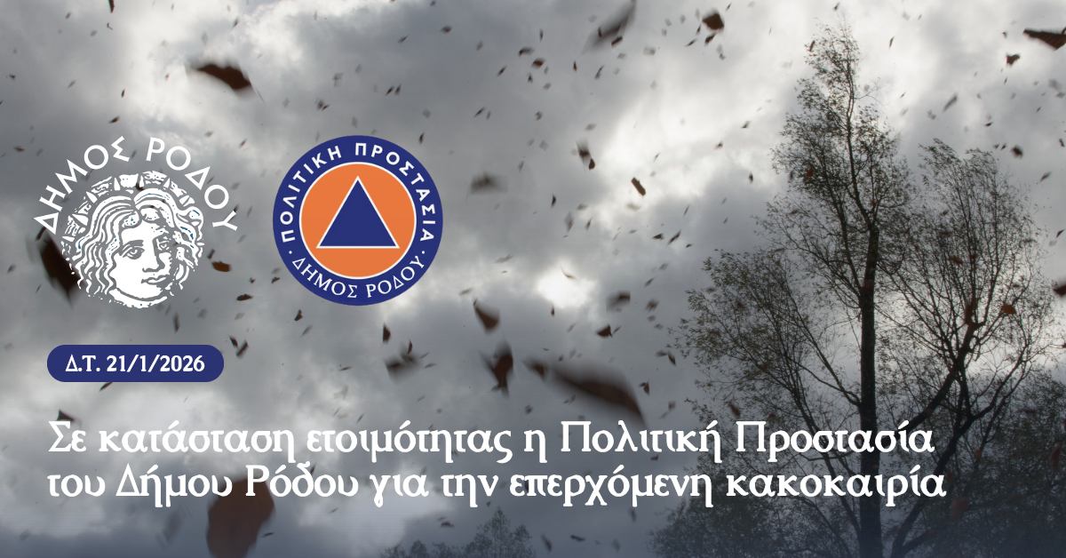 Ο Δήμος Ρόδου, σε συνέχεια του Έκτακτου Δελτίου Επικίνδυνων Καιρικών Φαινομένων που εξέδωσε η Εθνική Μετεωρολογική Υπηρεσία (ΕΜΥ), ενημερώνει τους κατοίκους και τους επισκέπτες του νησιού ότι αναμένεται επιδείνωση του καιρού από τις μεσημβρινές ώρες σήμερα Τετάρτη 21-01-2026 έως και το μεσημέρι της Πέμπτης 22-01-2026.