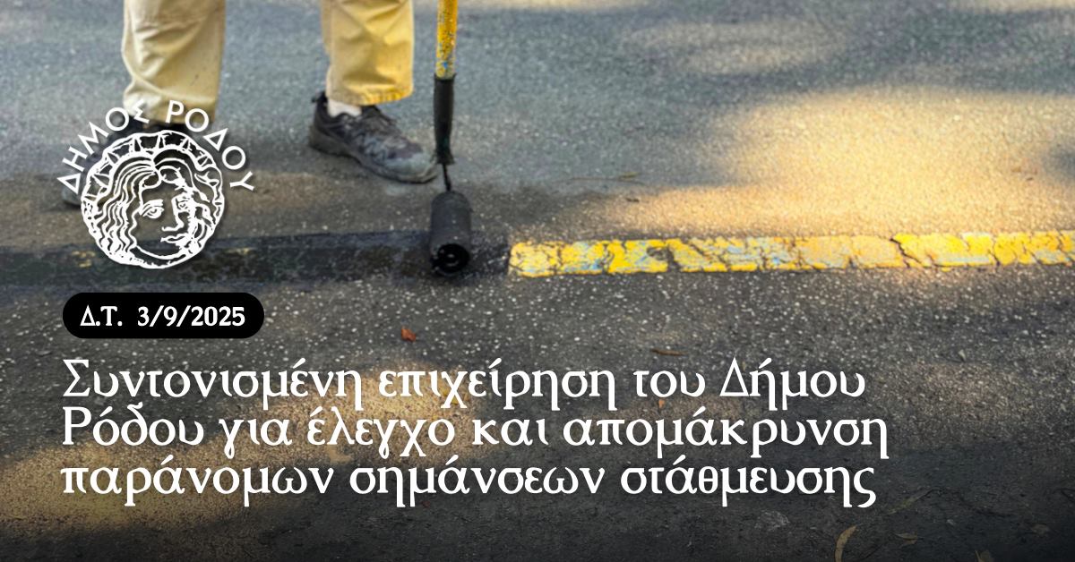 Σε νέα συντονισμένη επιχείρηση ελέγχου και απομάκρυνσης παράνομων σημάνσεων σε κοινόχρηστους χώρους στάθμευσης προχώρησαν σήμερα, Τετάρτη 3 Σεπτεμβρίου 2025, μικτά συνεργεία του Δήμου Ρόδου με τη συνδρομή της ΕΛ.ΑΣ., στις οδούς Γεωργίου Παπανικολάου, Στρ. Γεωργίου Γρίβα, Ίωνος Δραγούμη και Νικηφόρου Μανδηλαρά.