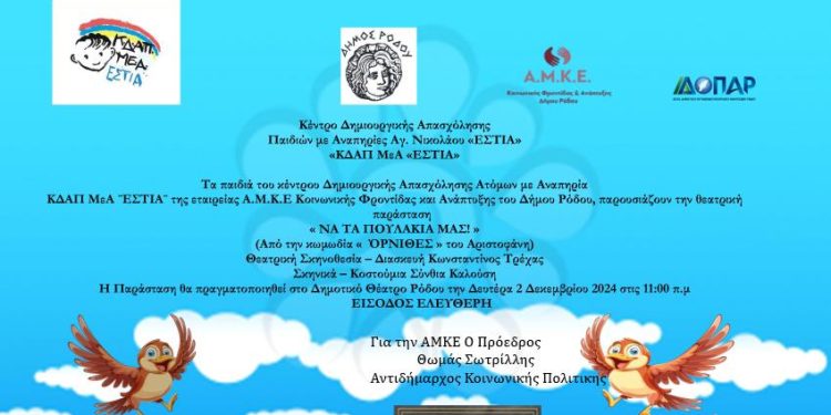 Την θεατρική διασκευή της κωμωδίας «ΟΡΝΙΘΕΣ» του αρχαίου κωμικού ποιητή Αριστοφάνη θα παρουσιάσουν τη Δευτέρα 02 Δεκεμβρίου 2024 στις 11:00 π.μ. στο Δημοτικό Θέατρο Ρόδου τα παιδιά του Κέντρου Δημιουργικής Απασχόλησης Παιδιών και Ατόμων με Αναπηρία «ΚΔΑΠ ΜεΑ ΕΣΤΙΑ» της ΑΜΚΕ Κοινωνικής Φροντίδας και Ανάπτυξης του Δήμου Ρόδου.