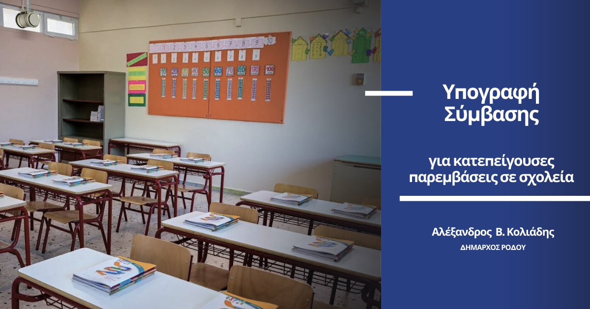 Σε ένα εκτεταμένο πρόγραμμα παρεμβάσεων σε σχολικές μονάδες της πρωτοβάθμιας και δευτεροβάθμιας εκπαίδευσης, με στόχο τη βελτίωση της ασφάλειας και της λειτουργικότητάς τους, προχωρά άμεσα ο Δήμος Ρόδου, μετά τη σύμβαση για την υλοποίηση των εργασιών που υπέγραψε ο Δήμαρχος Ρόδου Αλέξανδρος Κολιάδης.